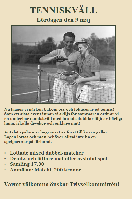 Nu lägger vi påsken bakom oss och fokuserar på tennis! Som ett sista event innan vi skiljs för sommaren ordnar vi en underbar kväll med lottade dubblar följt av härligt häng, iskalla drycker och enklare mat.